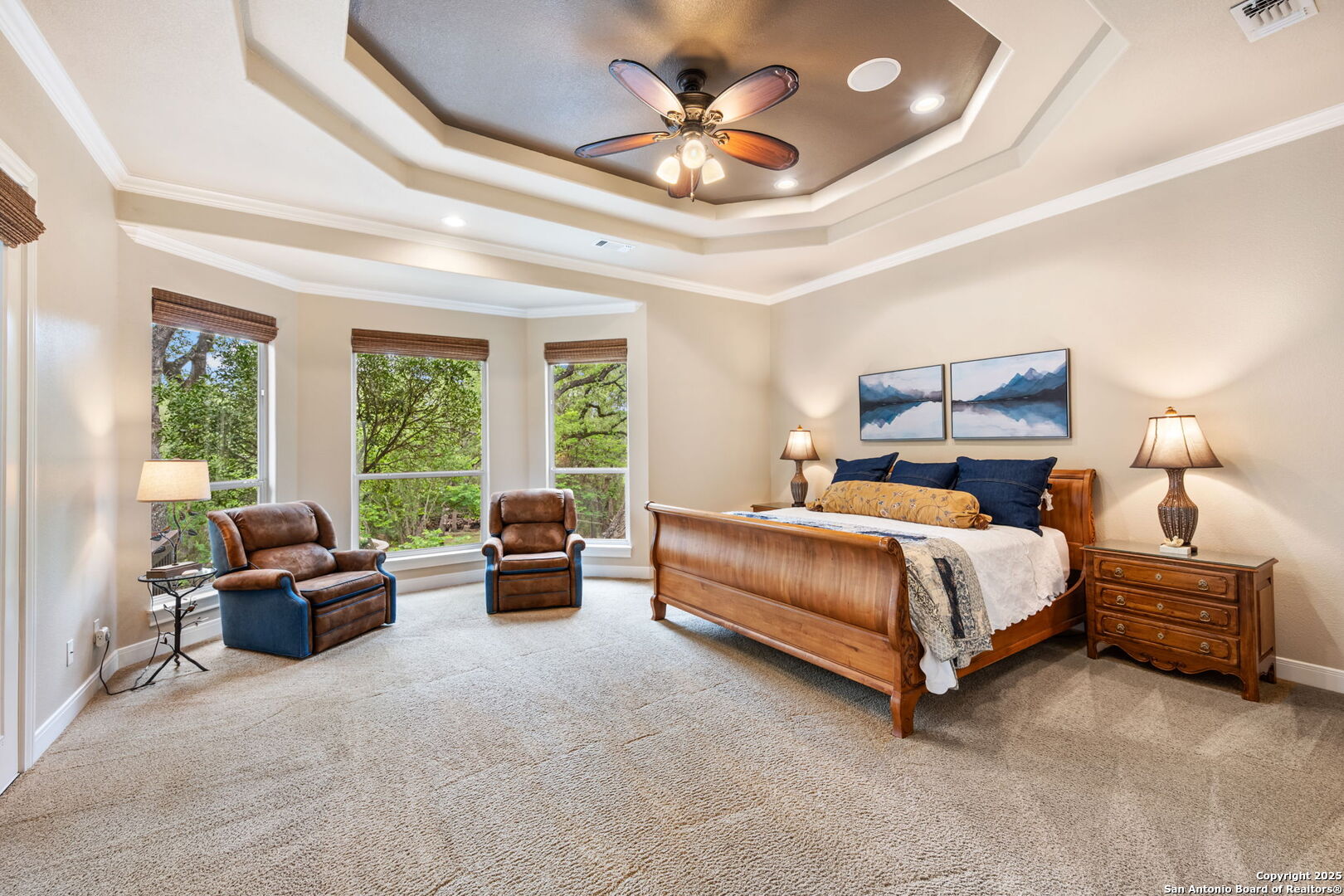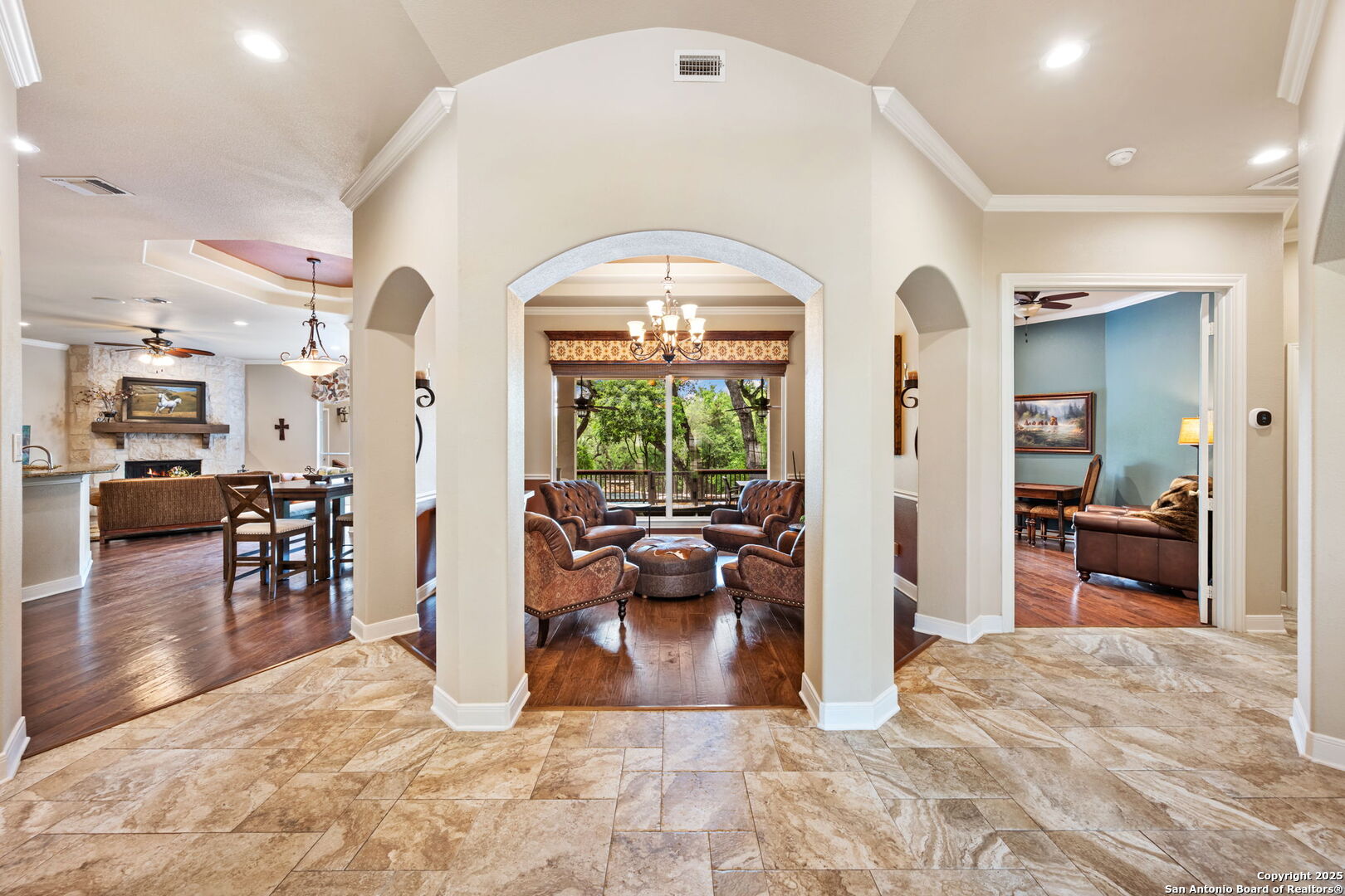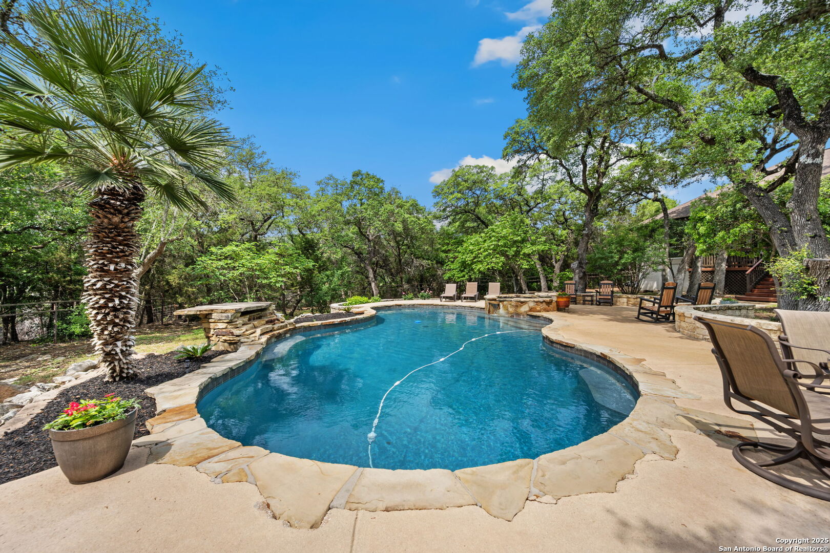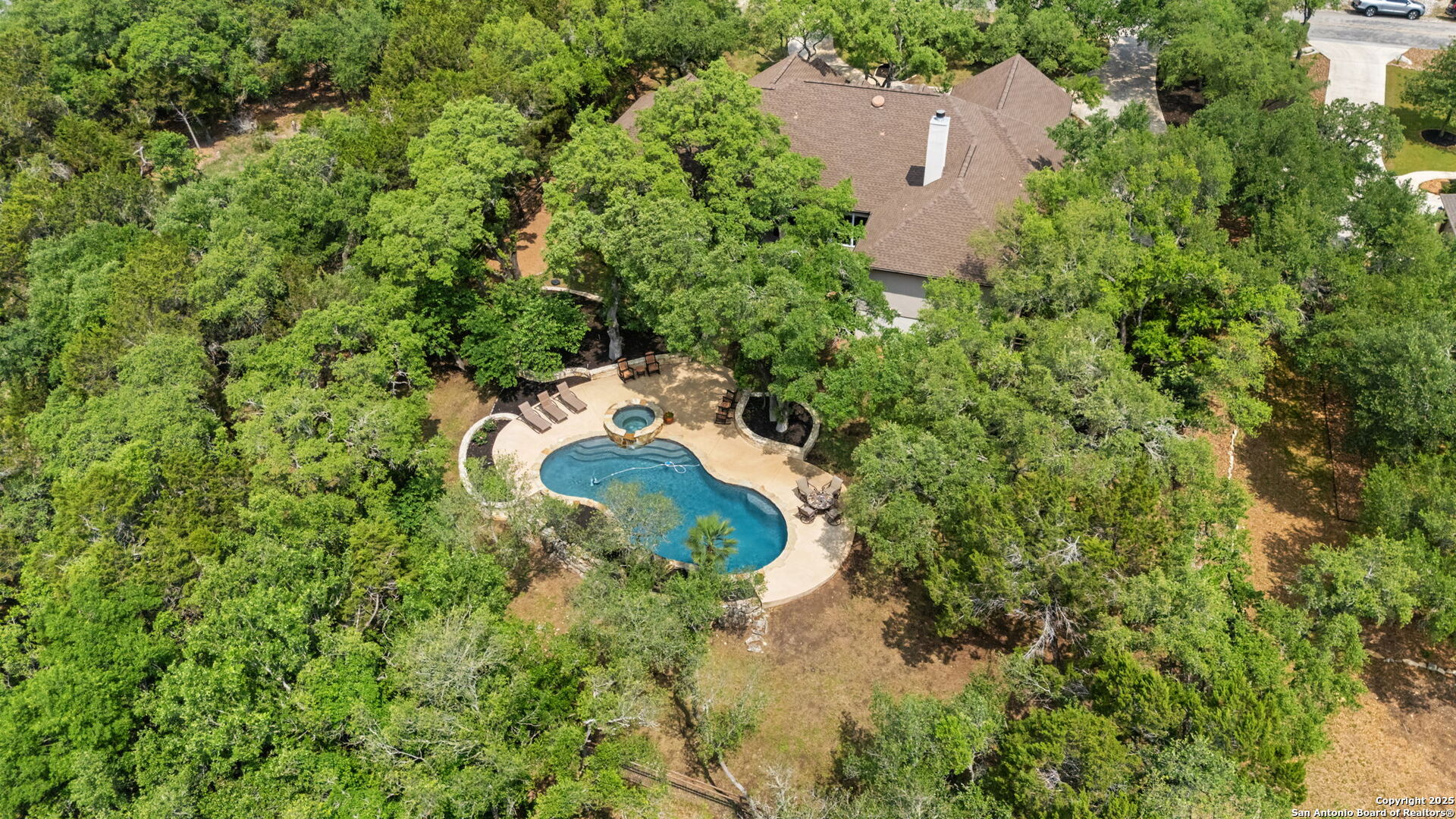 Experience luxury living right at home in the heart of River Crossing! This custom one-story residence blends elegance and comfort at every turn. Featuring a spacious open floor plan, this home includes 4 bedrooms, a dedicated study, a versatile flex room, a living room with a striking rock fireplace, and an elegant formal dining room. Throughout the home, you'll find exquisite wood flooring, tile and carpet that enhances the sense of space and luxury. The chef-inspired kitchen is a true highlight, featuring a built-in coffee bar, sleek granite countertops, double oven, a large walk-in pantry, and ample prep space. The oversized island/bar also offers extra seating, making it perfect for entertaining. With lots of room in the primary suite, the large walk-in closet was recently renovated, offering stylish organization and ample space for your wardrobe. The primary bath is a spa-like retreat, featuring a spacious shower, a luxurious jetted sauna tub, and a dual vanity for added convenience and comfort. Large windows flood the home with natural light, offering stunning views of the meticulously landscaped backyard and pool. Step outside to the covered back patio and experience pure tranquility in this oasis. Towering oak trees and lush greenery fill this property and create a serene, park-like setting. The backyard, fenced for your pets, is meticulously maintained with vibrant beds and manicured shrubbery. A sparkling large, heated saltwater pool and spa, complete with a soothing waterfall, provide the perfect setting for relaxation and outdoor entertainment. And don't forget the oversized 3-car garage. This home offers the perfect balance of beauty, privacy, elegance and comfort, making it the ideal retreat for those who value both style and serenity. River Crossing is located north of San Antonio, just minutes from 281, with lots of amenities and shopping nearby, including a beautiful 18-hole private golf course and clubhouse!